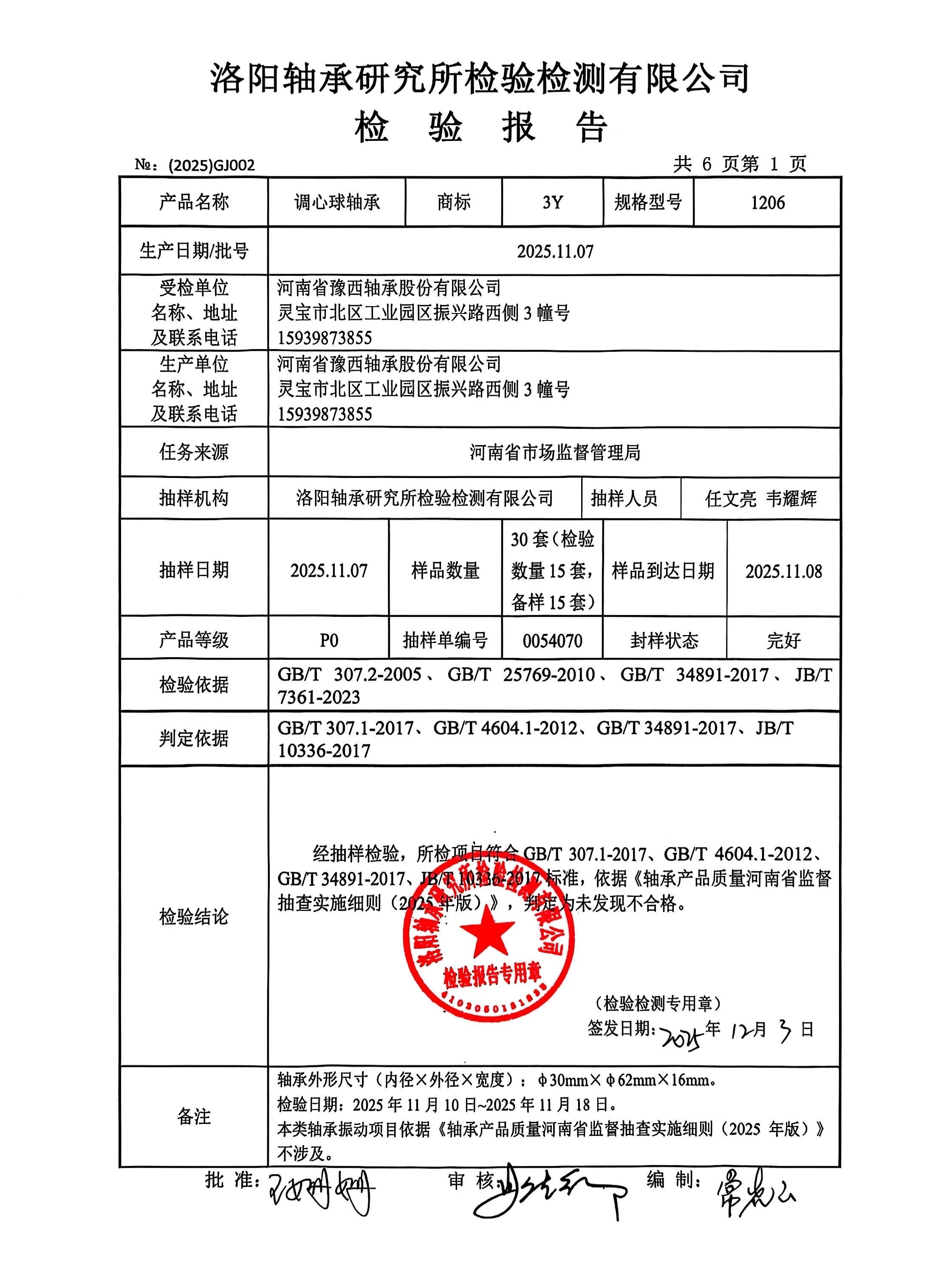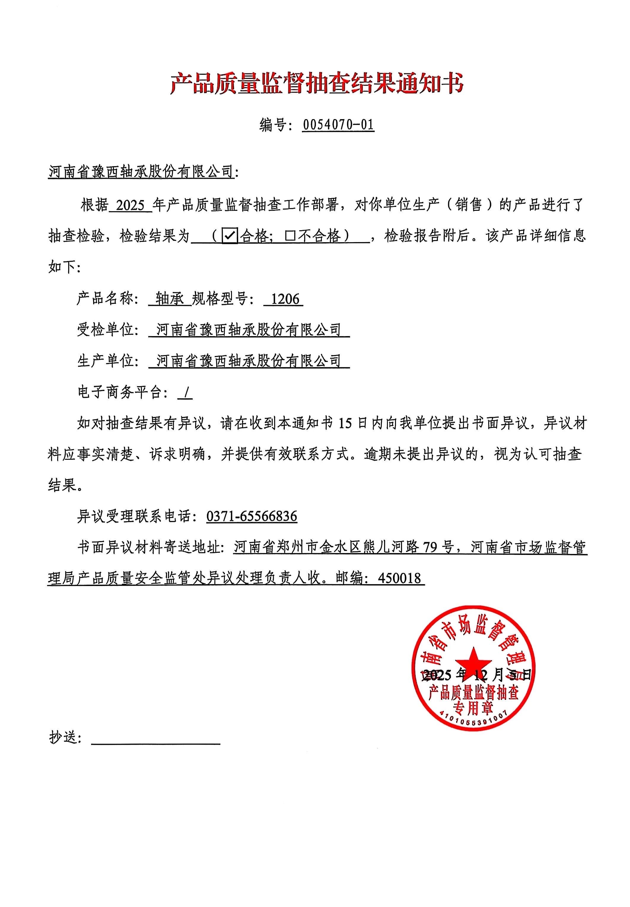 近日,我公司收到编号为0054070-01的《产品质量监督抽查结果通知书》。根据2025年产品质量监督抽查工作部署,监管部门对我司生产销售的1206型号轴承进行了严格的抽查检验,检验结果判定为合格,相关检验报告已正式送达。这一结果不仅是对我司产品质量的权威认可,更是对豫西轴承数十年如一日坚守品质初心的有力印证。