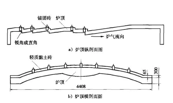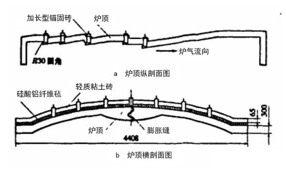 3.在炉顶中间相邻的两件锚固砖之间增设一条宽度为8mm的纵向膨胀缝,缓解炉顶耐火材料降温收缩和升温膨胀时的应力集中,避免出现纵向开裂。